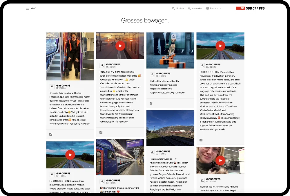 Die SBB AG ist das grösste Unternehmen des öffentlichen Verkehrs in der Schweiz und eine der grössten Arbeitgeberinnen des Landes. Im kontinuierlichen Austausch mit Millionen von Reisenden und der breiten Öffentlichkeit ist eine wirkungsvolle, aktuelle und gut steuerbare Kommunikation entscheidend. Über ihre zahlreichen digitalen Touchpoints hinweg setzt die SBB auf vielseitige, mehrsprachige Kommunikationsformate, die von unterschiedlichen Teams parallel umgesetzt werden. Mit contentfry nutzt die SBB Social Walls als flexible Integration auf unterschiedlichen Websites und digitalen Screens an mehreren Bahnhöfen. Projekte lassen sich dabei plattformübergreifend einfach umsetzen, individuell anpassen und effizient verwalten – selbst bei einer grossen Anzahl paralleler Social Walls.