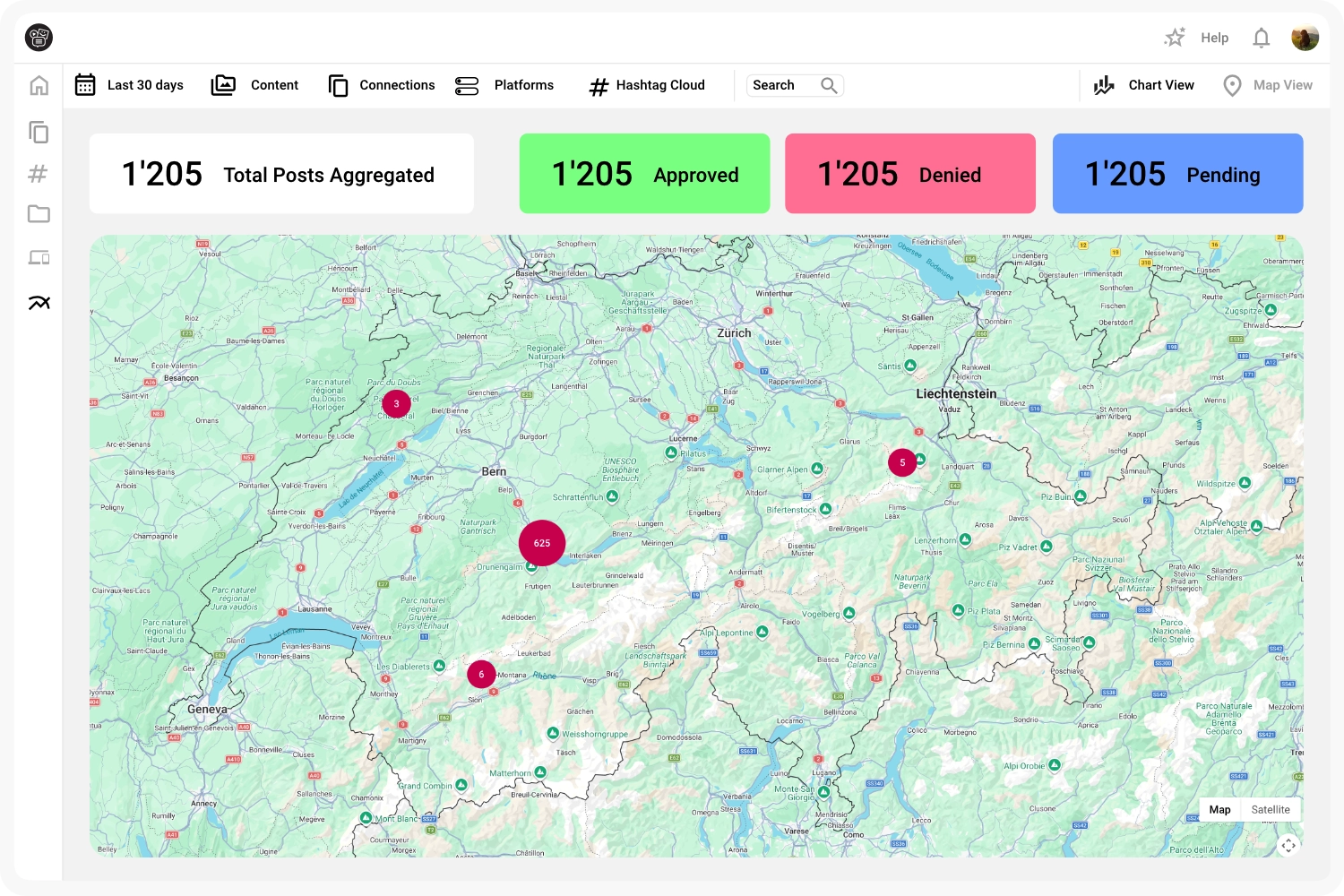 Mit der Insights Map View erkennst du auf einen Blick, wo Social-Media-Aktivitäten stattfinden und welche Inhalte lokal erstellt wurden. Filtere flexibel nach Zeitraum, Inhalt, Plattform oder Connections und gewinne wertvolle geografische Einblicke in deine Social Media Performance.
