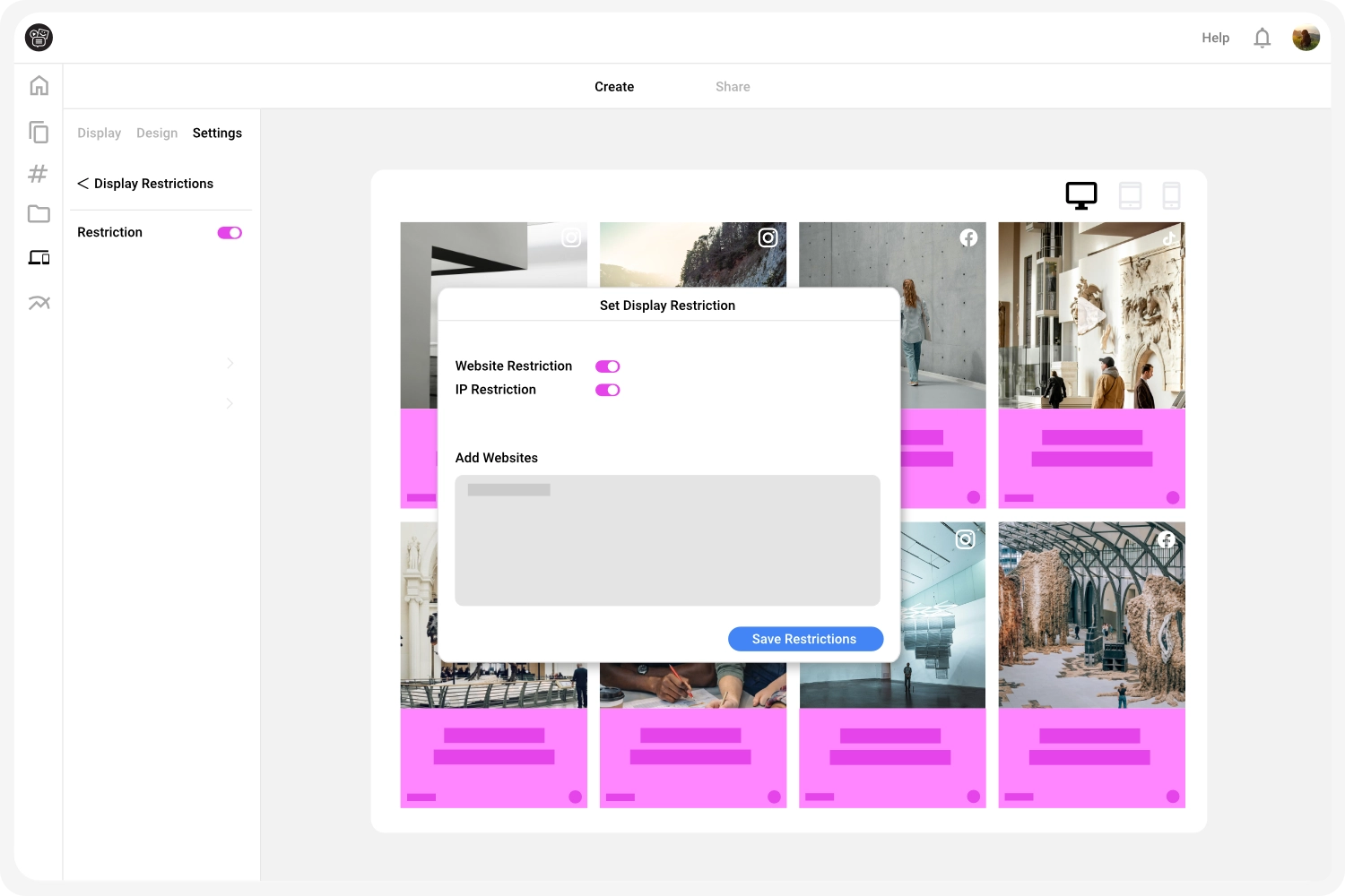 Maintain full control over where your content is displayed. Use the restriction settings in the editor to limit access to your social wall to specific domains or authorized IP addresses.