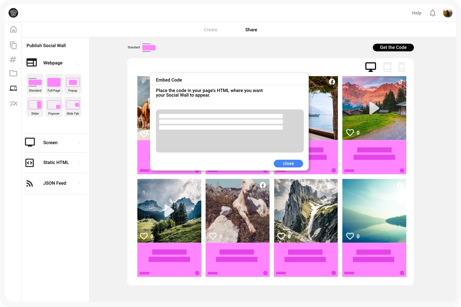 Publish your display as usual. Reactions are instantly active in the embed code for your website or the URL for your event screens—no additional coding required.